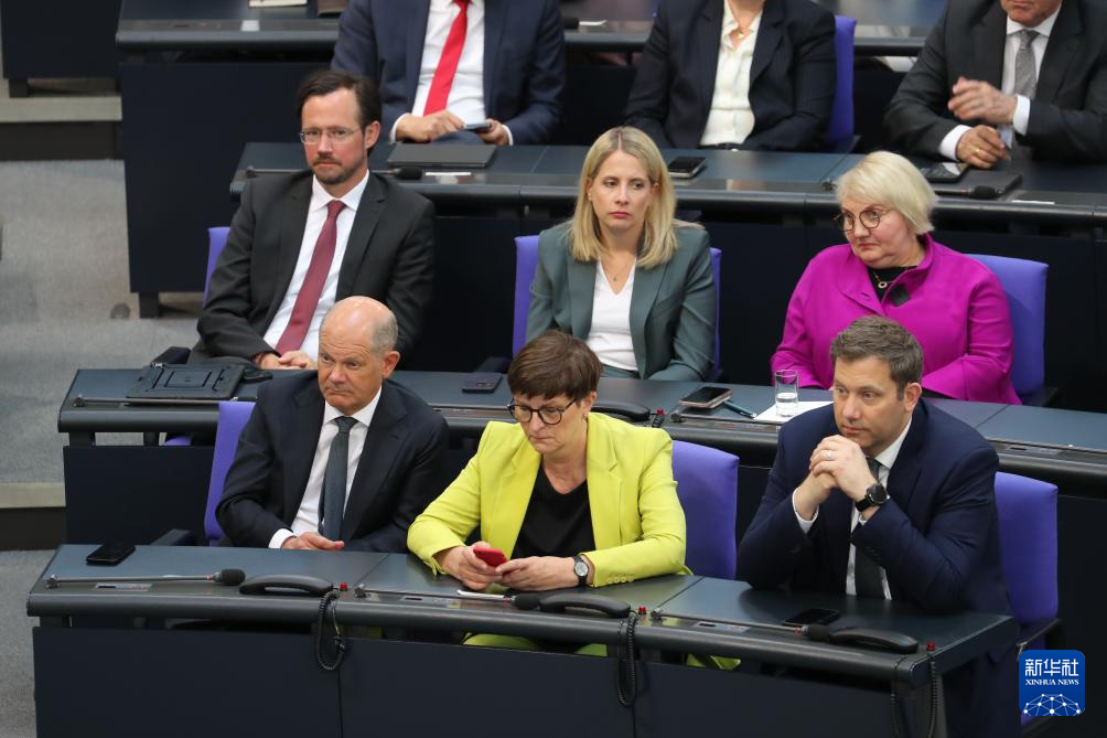 5月6日,在德国首都柏林的国会大厦,即将卸任的德国总理朔尔茨(前排左一)在第二轮投票议程中。