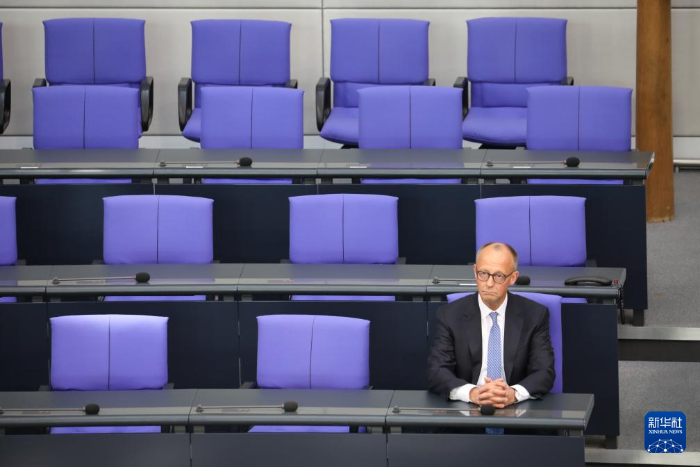 5月6日,在德国首都柏林的国会大厦,默茨宣誓后坐在议会的总理席位上。
