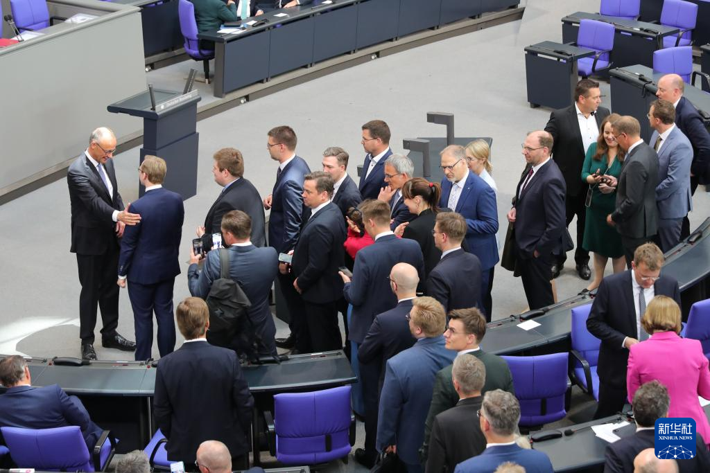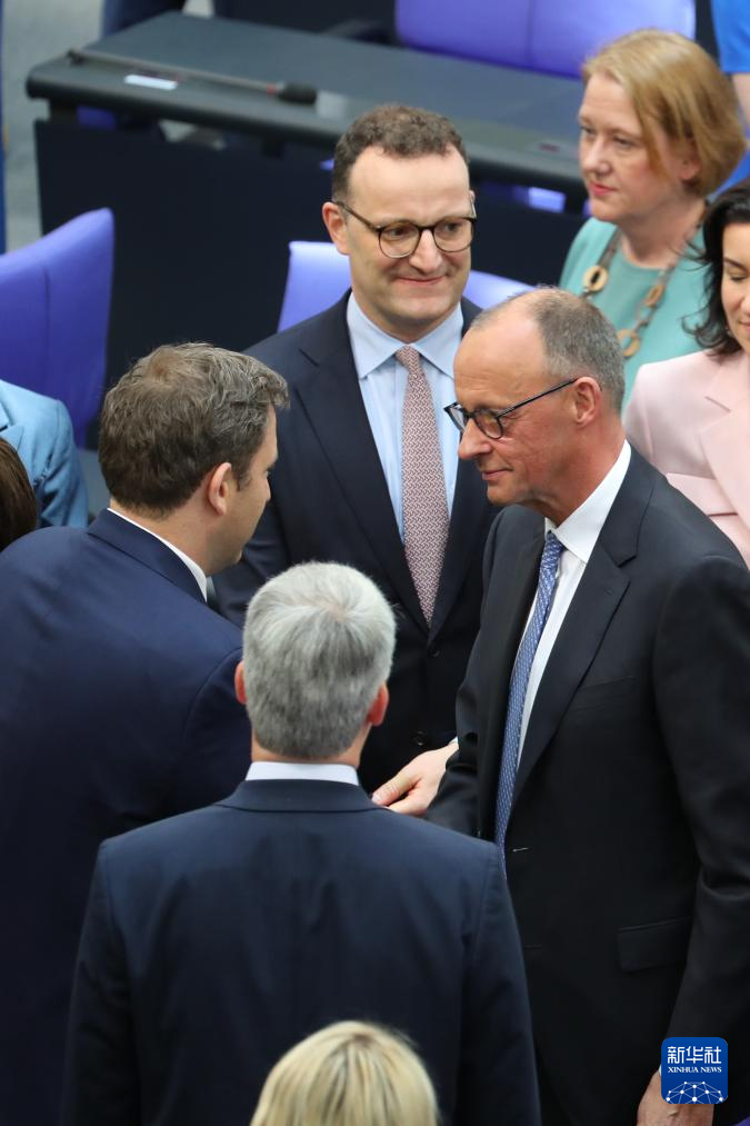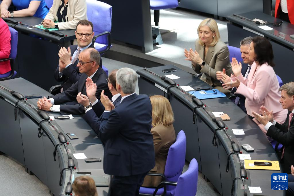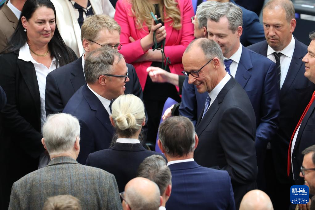 5月6日,在德国首都柏林的国会大厦,默茨宣誓就职后接受祝贺。