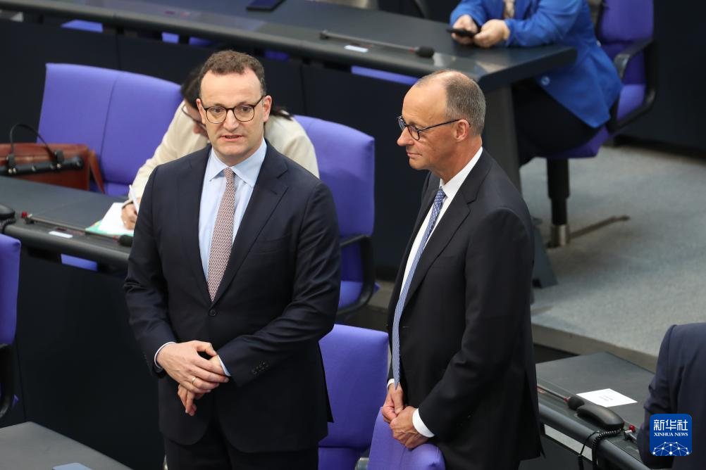 5月6日,在德国首都柏林的国会大厦,默茨(右)在第二轮投票议程中。