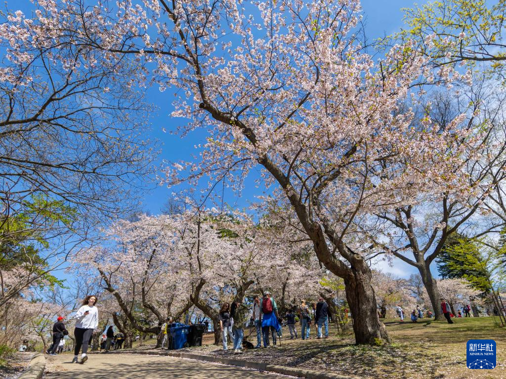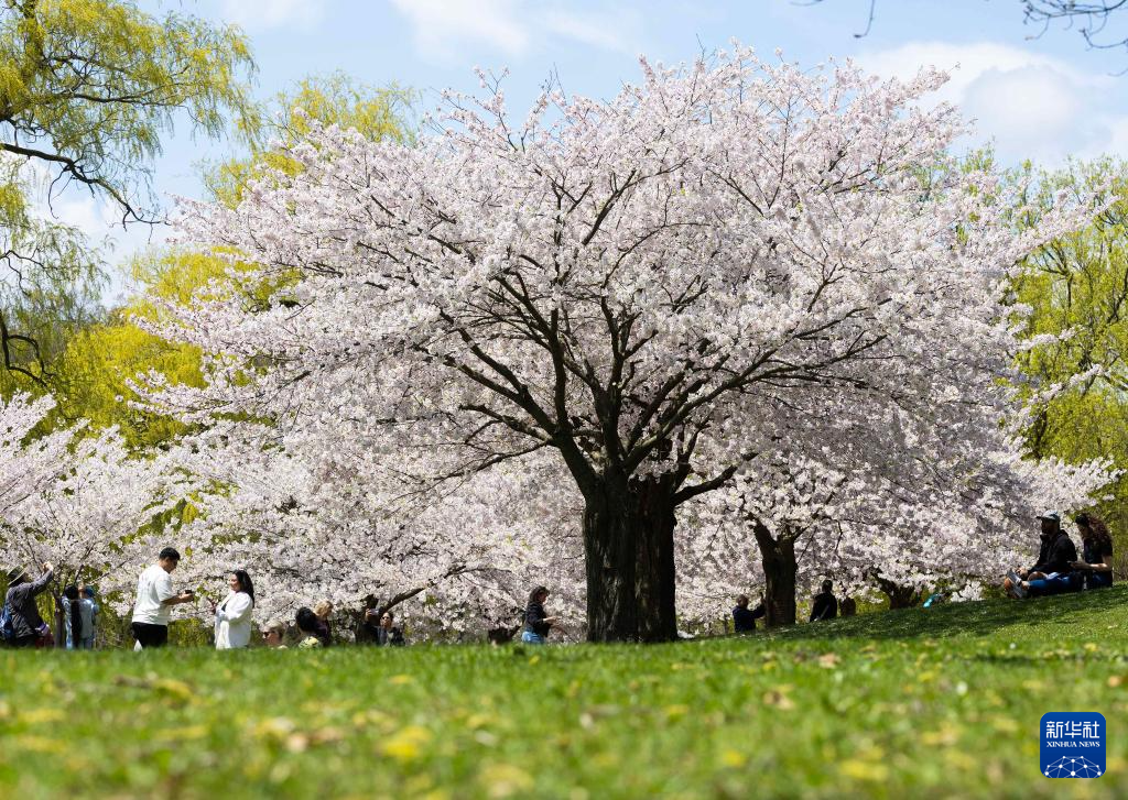 5月6日,人们在加拿大多伦多的一处公园内欣赏盛开的樱花。