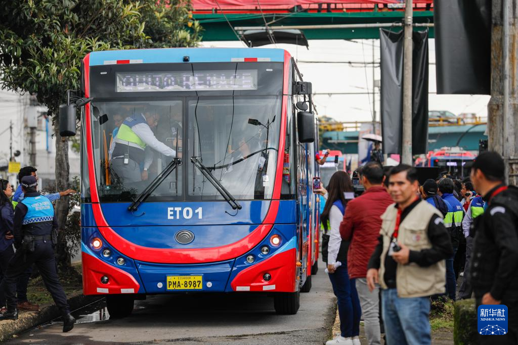 2025年3月31日,在厄瓜多尔首都基多,人们体验宇通双源无轨电车。