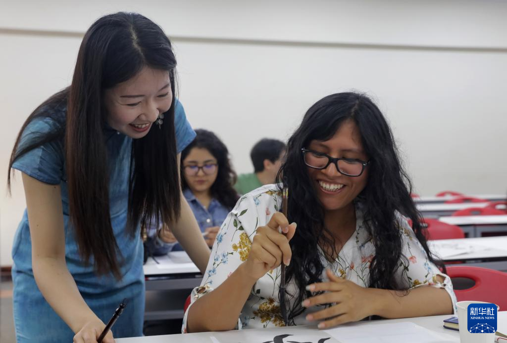2025年4月22日,在秘鲁首都利马,秘鲁天主教大学孔子学院中文教师梁卿(左)辅导秘鲁学生写书法。