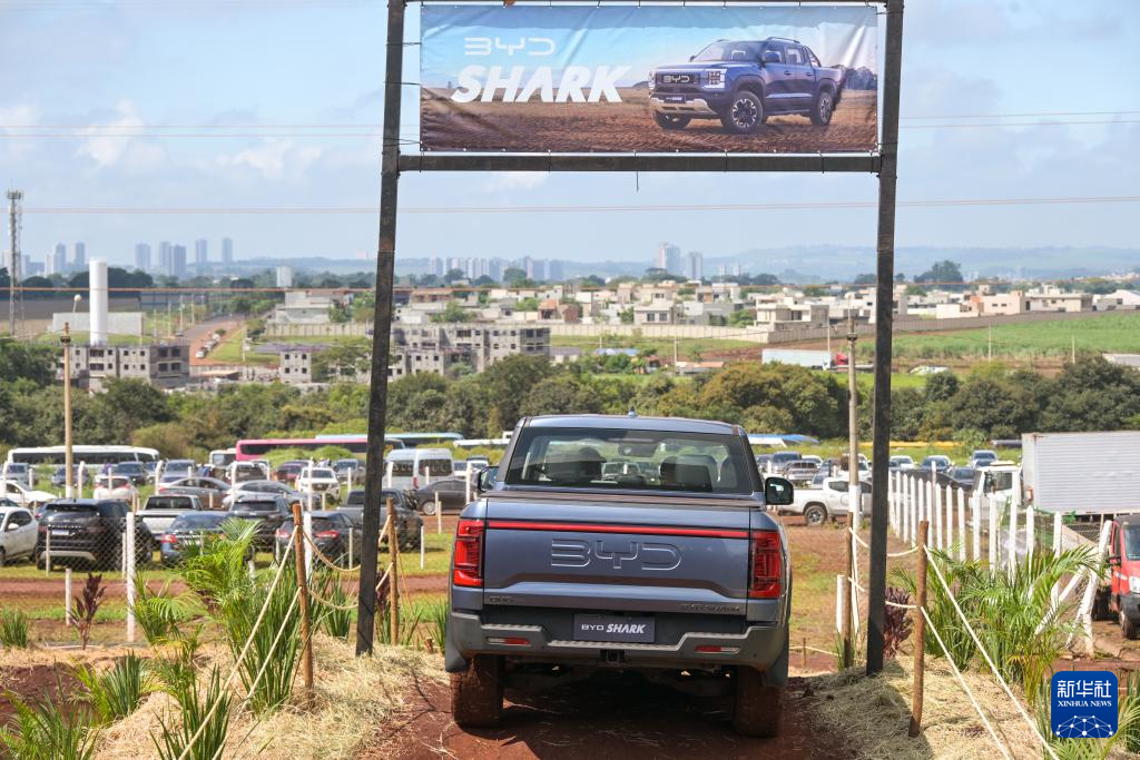 2025年4月29日,在巴西圣保罗州里贝朗普雷图市举行的2025年巴西农业科技展上,一辆比亚迪皮卡进行越野演示。