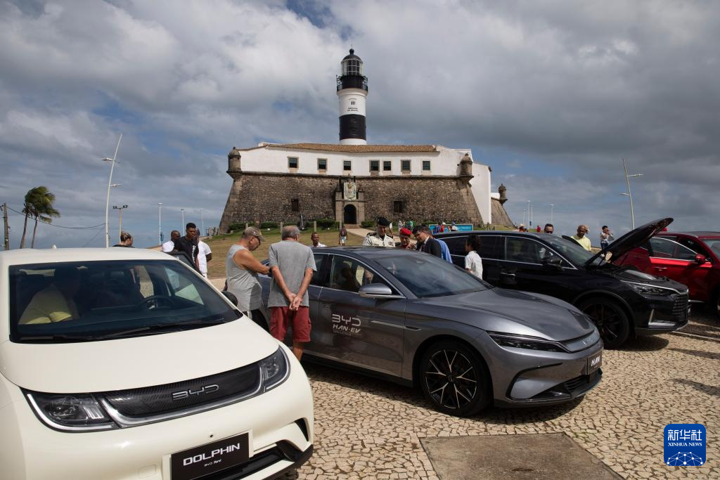 2023年7月4日,参观者在巴西巴伊亚州首府萨尔瓦多观看比亚迪纯电动汽车。