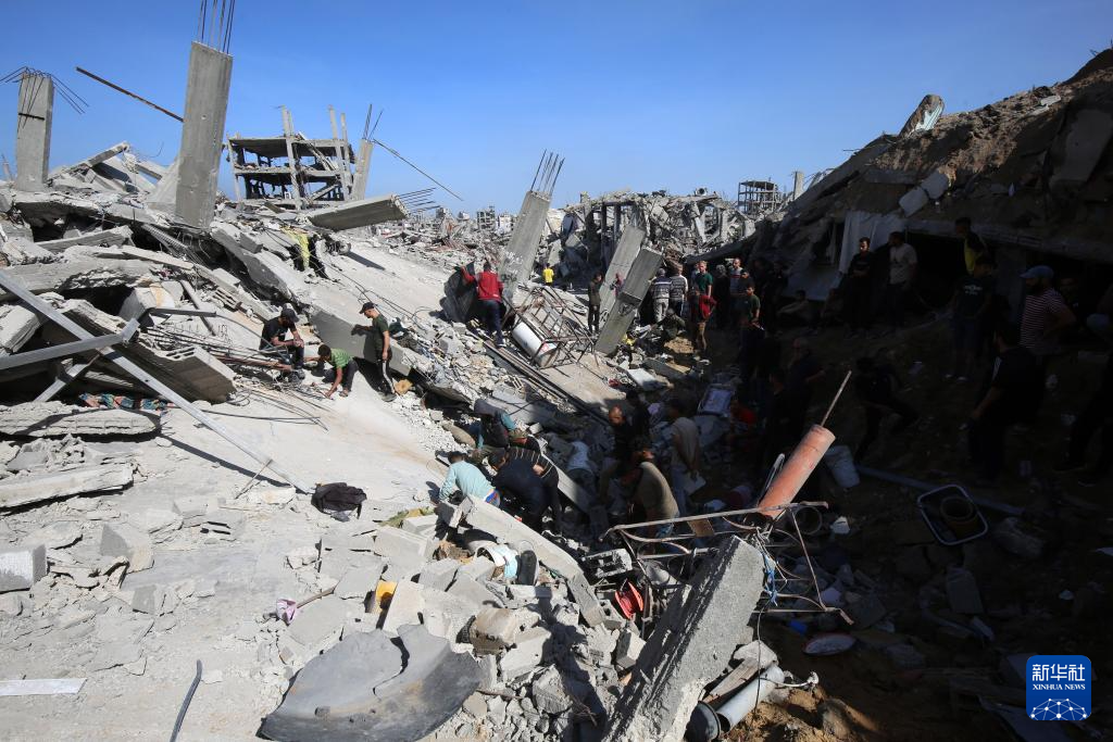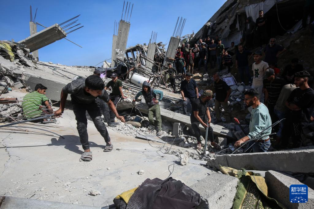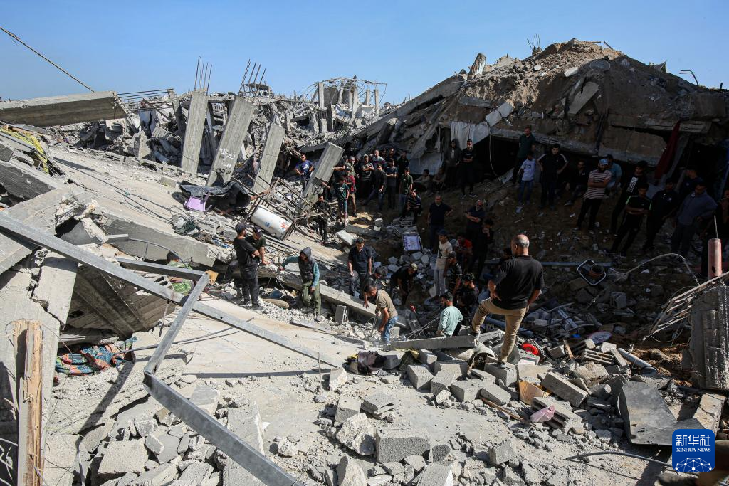 5月16日,在加沙地带北部杰巴利耶难民营,人们查看以军袭击后的建筑废墟。
