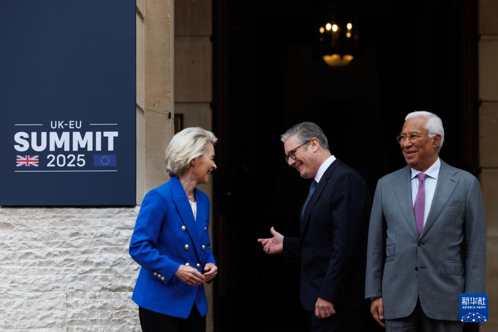 5月19日,英国首相斯塔默(中)在伦敦与欧盟领导人举行会议前同欧盟委员会主席冯德莱恩(左)交谈。
