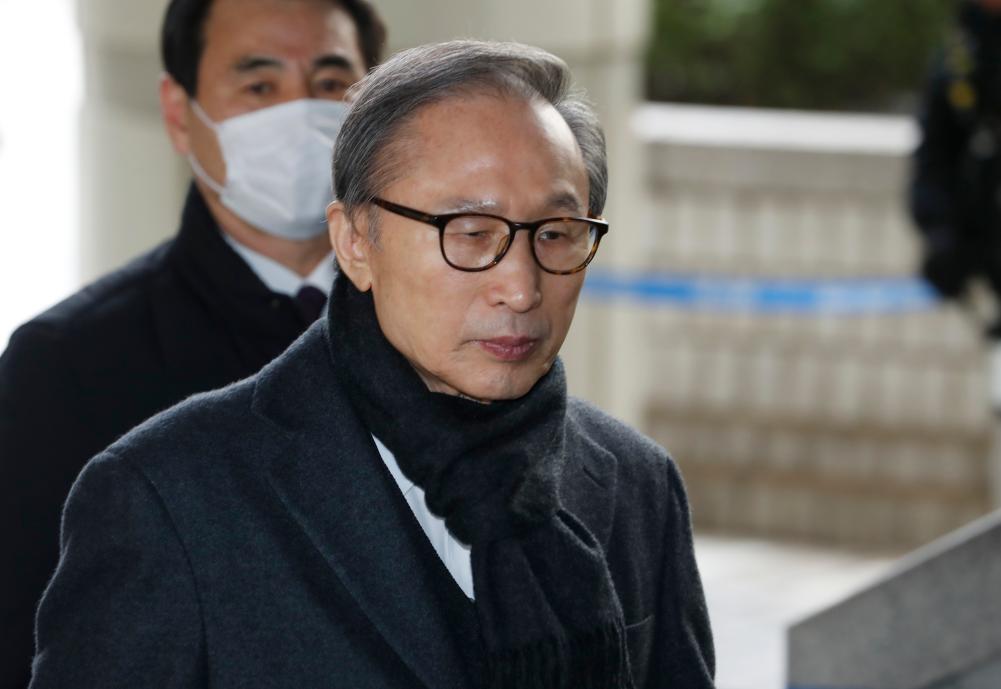 图为2020年2月19日,李明博(前)抵达韩国首尔高等法院。新华社/纽西斯通讯社