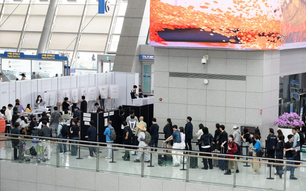 5月29日,选民在韩国仁川机场的投票站排队等待投票。新华社发(全休相摄)