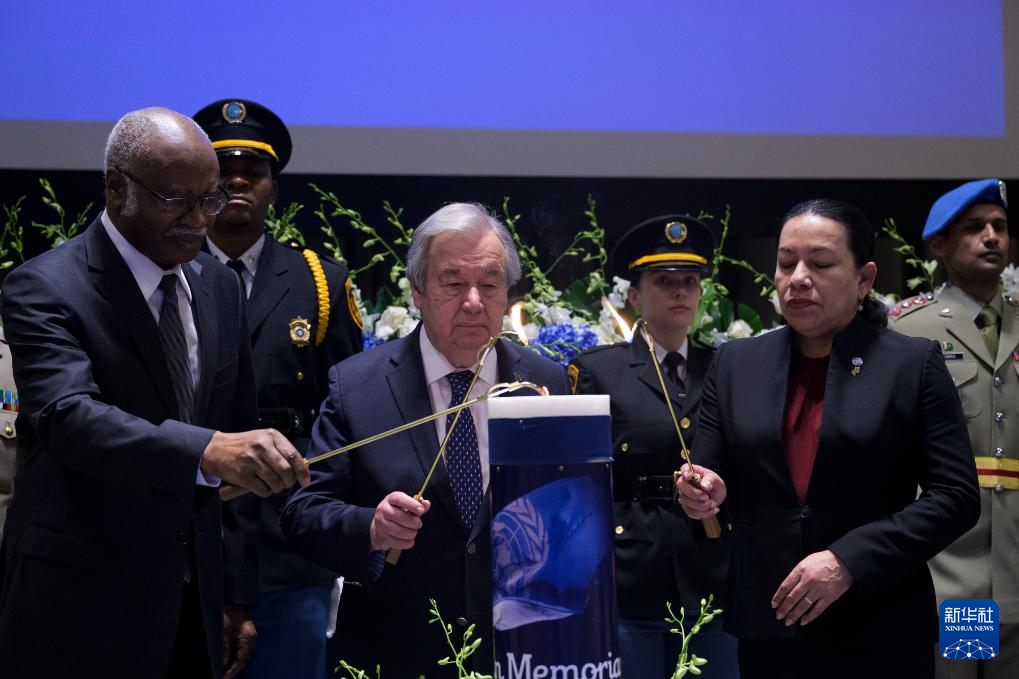 6月5日,在位于纽约的联合国总部,联合国秘书长古特雷斯(前中)、第79届联合国大会主席菲勒蒙·扬(前左)在缅怀2024年因公殉职工作人员追悼仪式上点燃蜡烛。