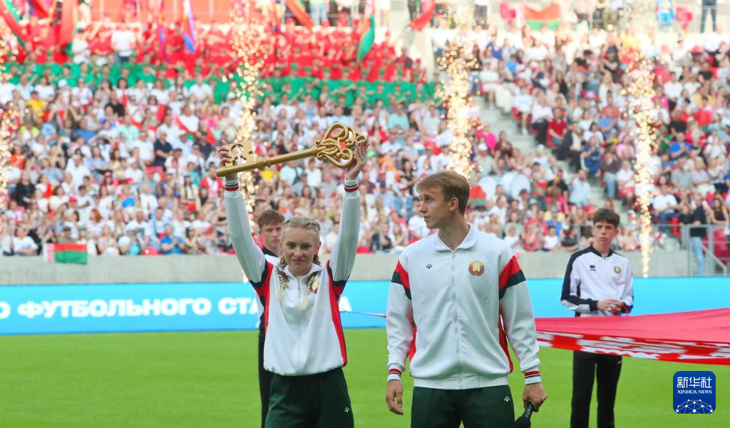 6月7日,在白俄罗斯首都明斯克,白俄罗斯运动员代表展示象征中国援白俄罗斯国家足球体育场项目的“钥匙”。