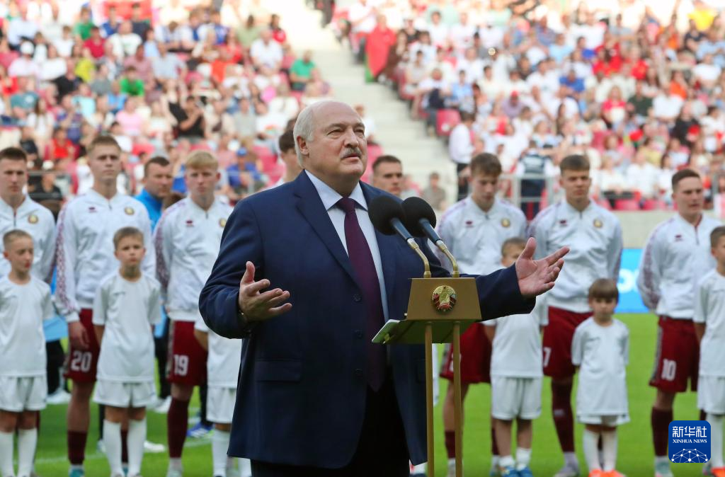 6月7日,在白俄罗斯首都明斯克,白俄罗斯总统卢卡申科在中国援白俄罗斯国家足球体育场启用仪式上致辞。