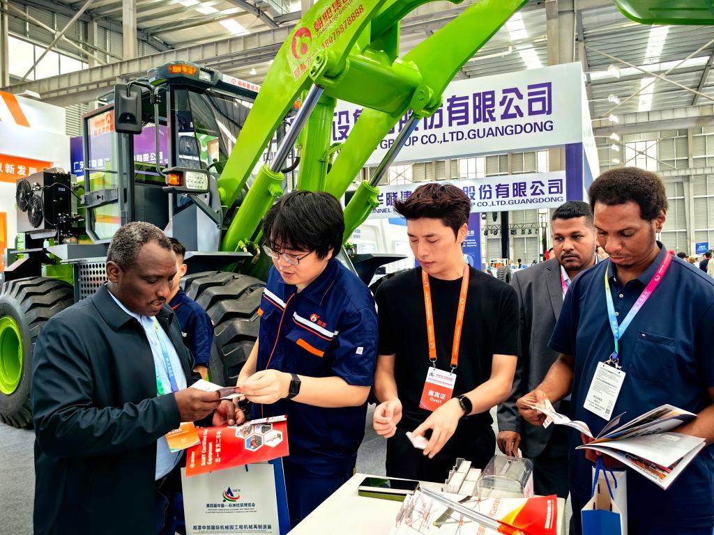 非洲国家客商在衡阳市朝阳重机有限公司再制造电动装载机展位咨询。新华社记者苏晓洲 摄