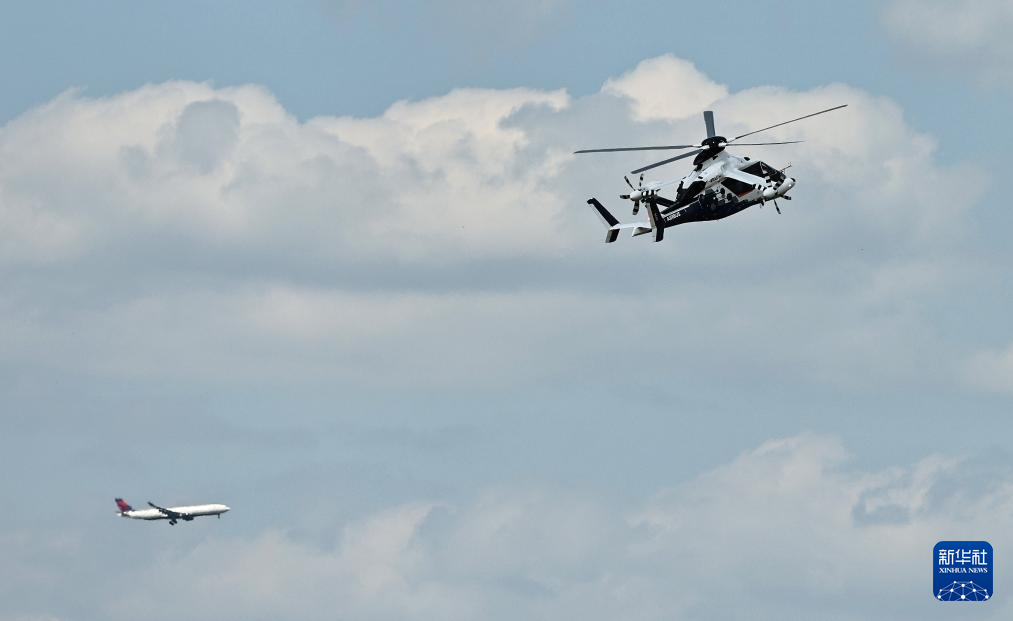 6月17日,在法国巴黎近郊布尔歇机场举行的第55届巴黎航展上,空客RACER直升机(上)进行飞行表演。