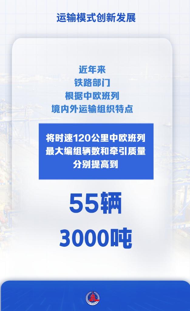 近年来,铁路部门根据中欧班列境内外运输组织特点,将时速120公里中欧班列最大编组辆数和牵引质量分别提高到55辆、3000吨。