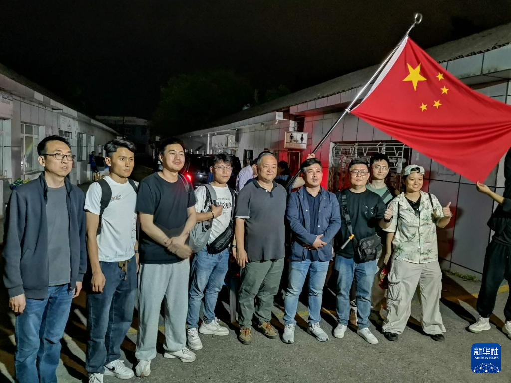 6月19日,从伊朗经阿斯塔拉陆路口岸撤入阿塞拜疆境内的中国公民与前来接应的中国驻阿塞拜疆使馆工作人员在阿斯塔拉口岸合影留念(手机照片)。新华社发(中国驻阿塞拜疆使馆供图)