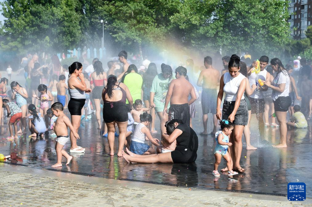 6月29日,市民在西班牙马德里的公园喷泉里戏水。