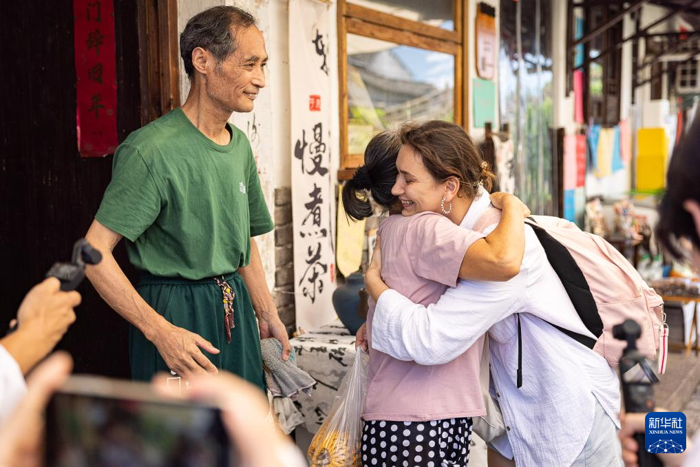 7月1日,莎河娜斯在绍兴与陶奶奶拥抱问候。