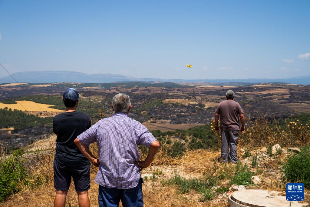 7月2日,在西班牙列伊达,当地居民远眺灭火飞机作业。