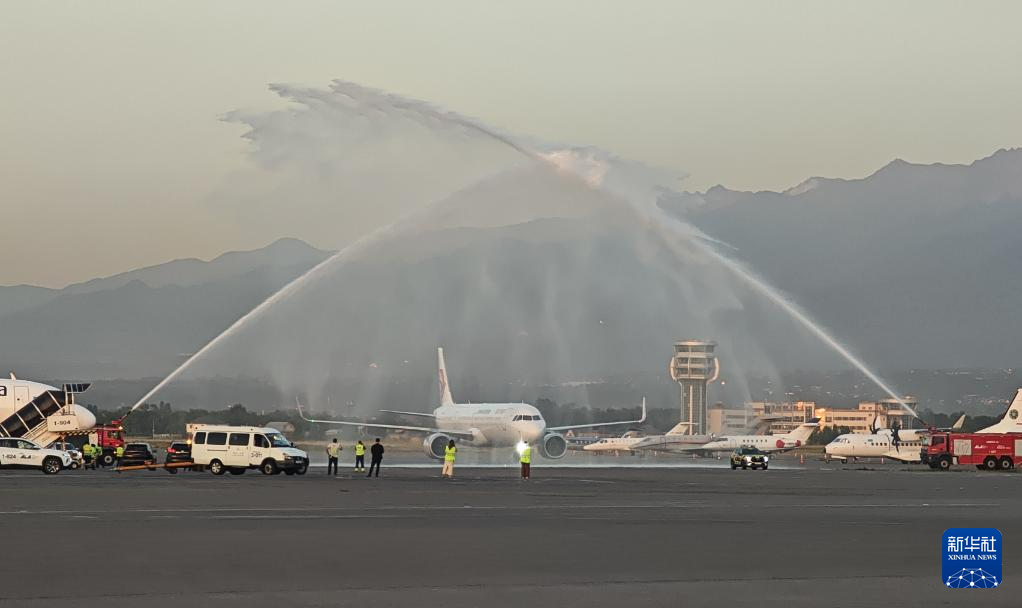 7月4日,在哈萨克斯坦阿拉木图国际机场,东方航空公司上海至阿拉木图直飞航线客机穿过象征民航最高礼仪的“水门”。新华社发(东方航空供图)