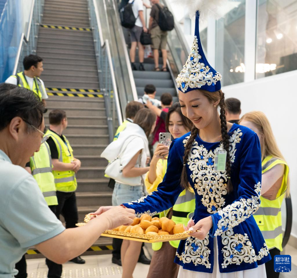 7月4日,在哈萨克斯坦阿拉木图国际机场,哈方工作人员欢迎中国东方航空公司上海至阿拉木图直飞航班旅客。新华社发(蔡其雄摄)