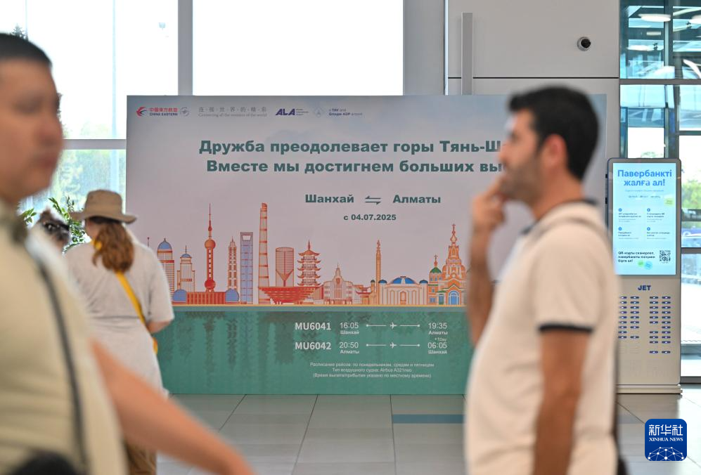 7月4日,东方航空公司上海至阿拉木图直飞航线展板摆放在哈萨克斯坦阿拉木图国际机场。新华社记者 李任滋 摄