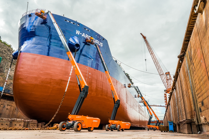 2022年10月19日,舟山万邦重工的自行走直臂式高空作业平台车正在作业。(舟山万邦重工供图)