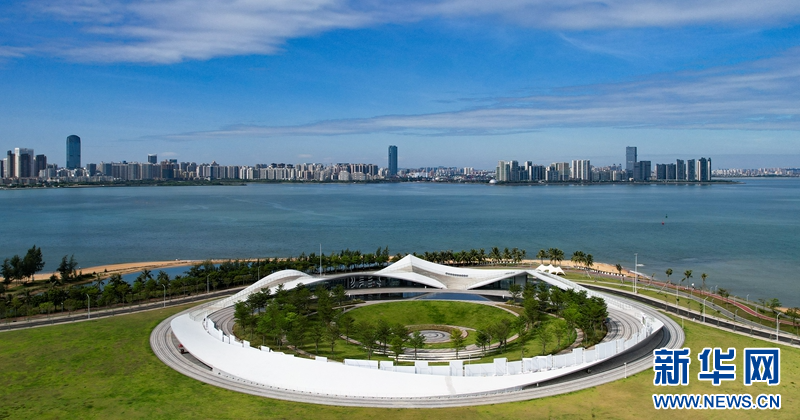 2023年8月8日,鸟瞰位于海口市海口湾的“天空之山”驿站(无人机照片)。新华社记者 杨冠宇 摄