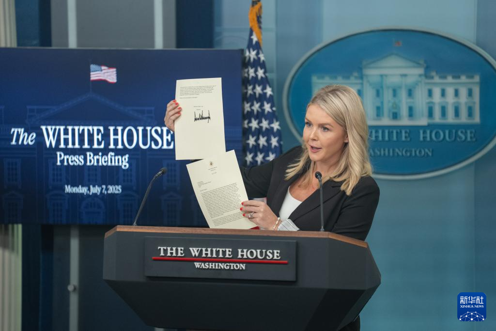 7月7日,在美国首都华盛顿白宫,白宫新闻发言人卡罗琳·莱维特在记者会上展示美国总统特朗普致韩国总统的信函。