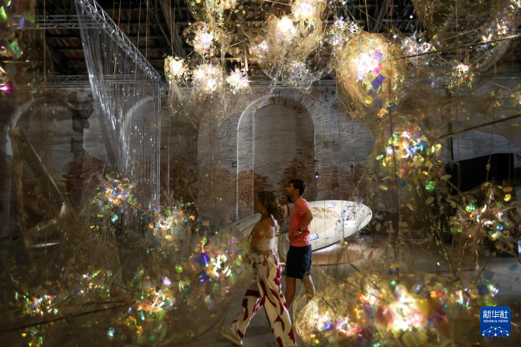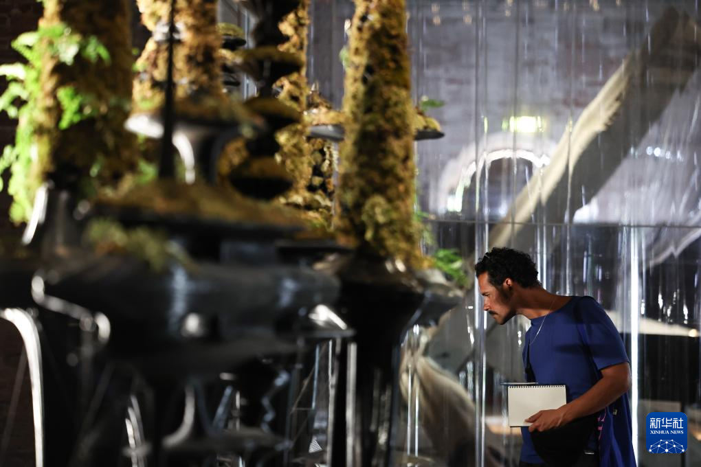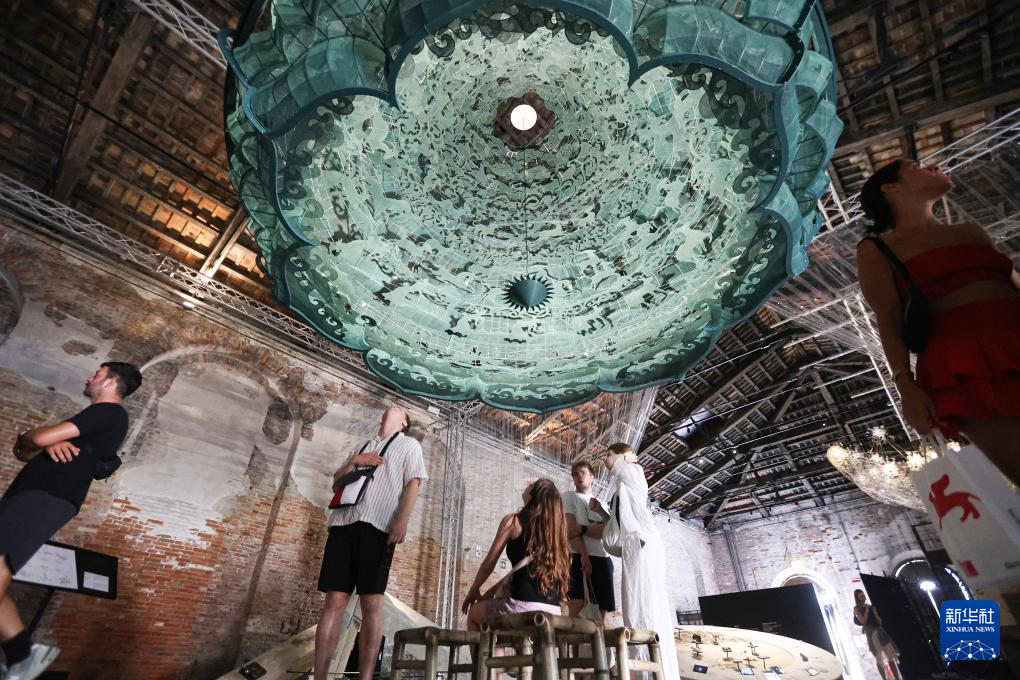 7月16日,在意大利威尼斯,参观者在第19届威尼斯国际建筑双年展中国馆观看展品《苍穹》。