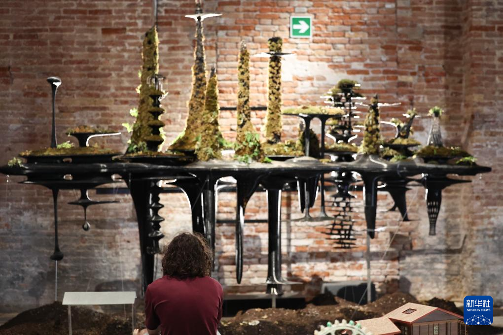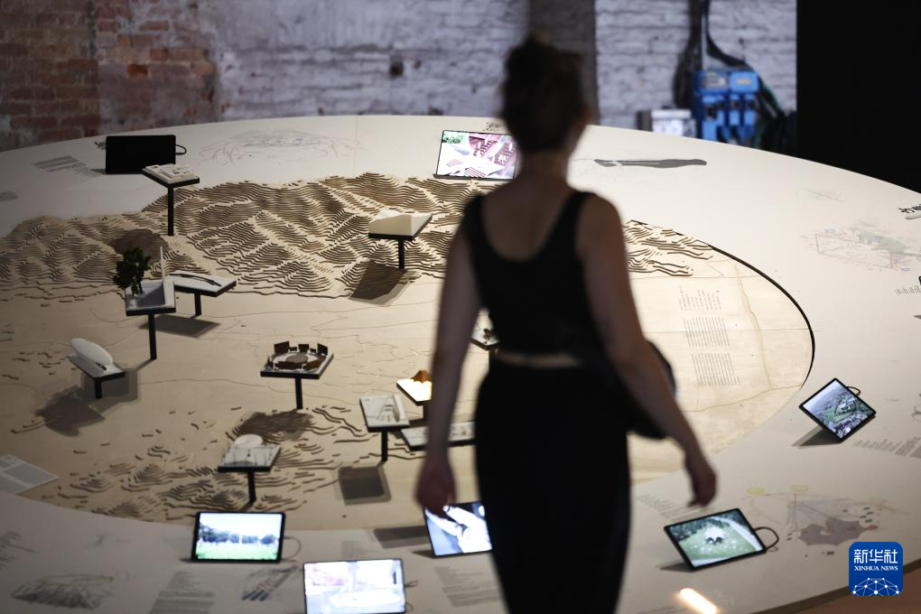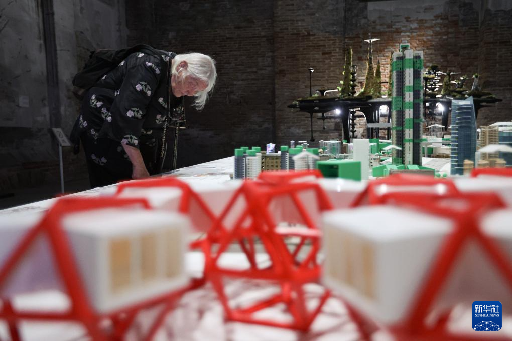 7月16日,在意大利威尼斯,参观者在第19届威尼斯国际建筑双年展中国馆观看展品《更新城》。
