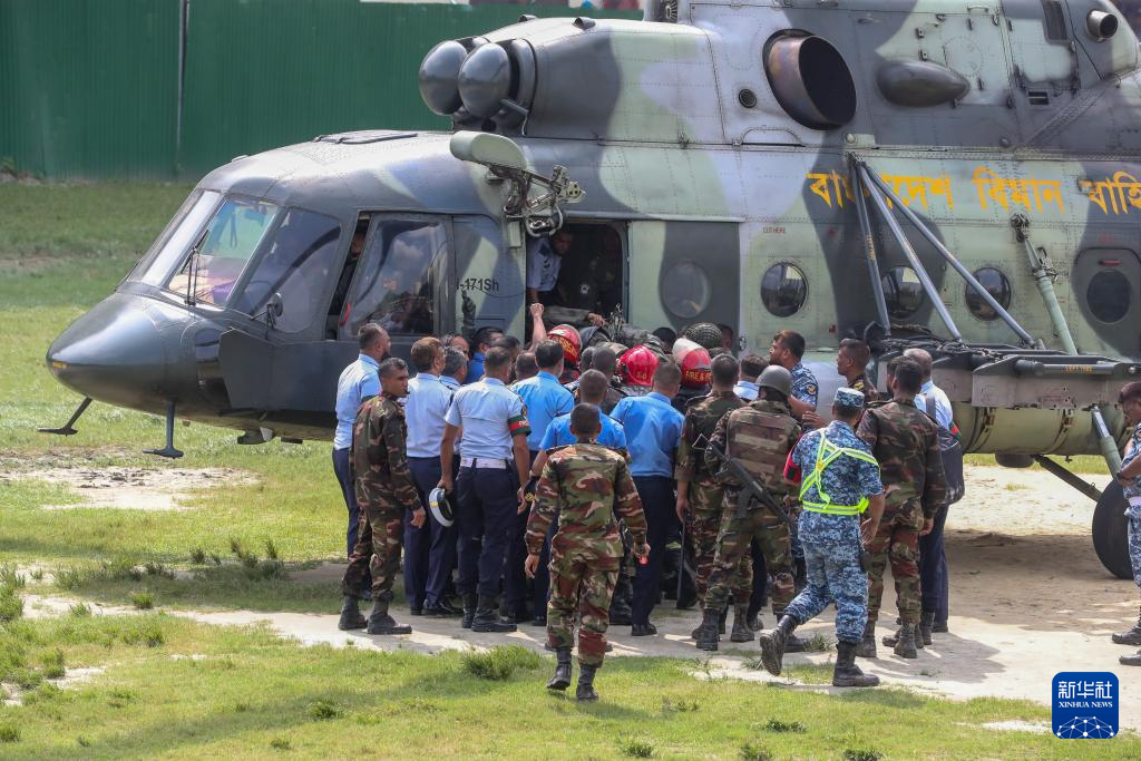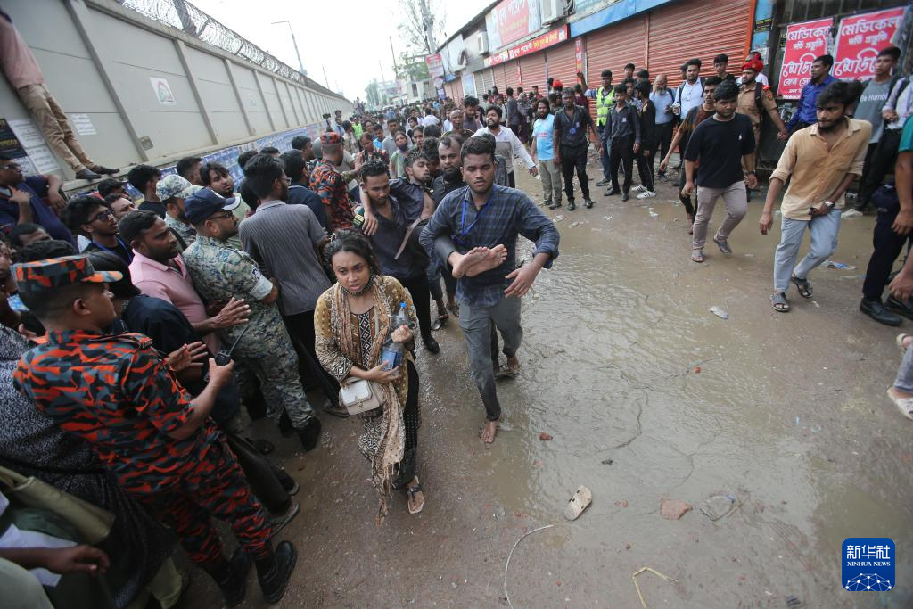 7月21日,在孟加拉国首都达卡,人们将伤者从教练机坠毁现场送去接受救治。