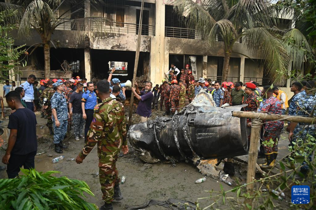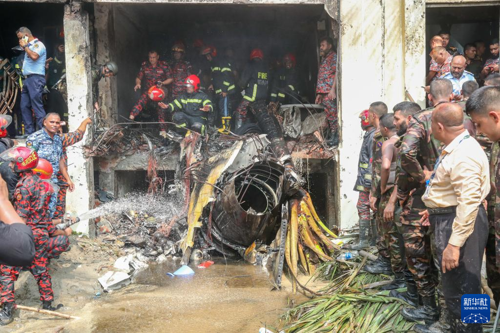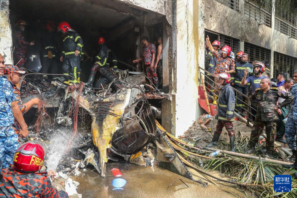 7月21日,在孟加拉国首都达卡,消防人员在教练机坠毁现场工作。