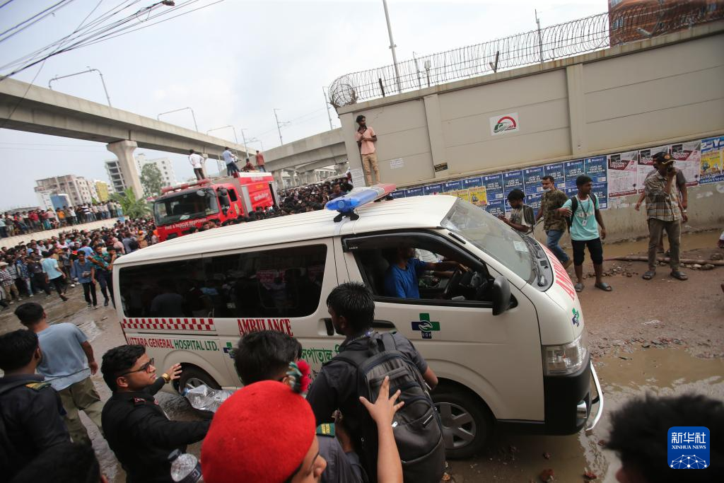 7月21日,在孟加拉国首都达卡,救护车将伤者从教练机坠毁现场送往医院。