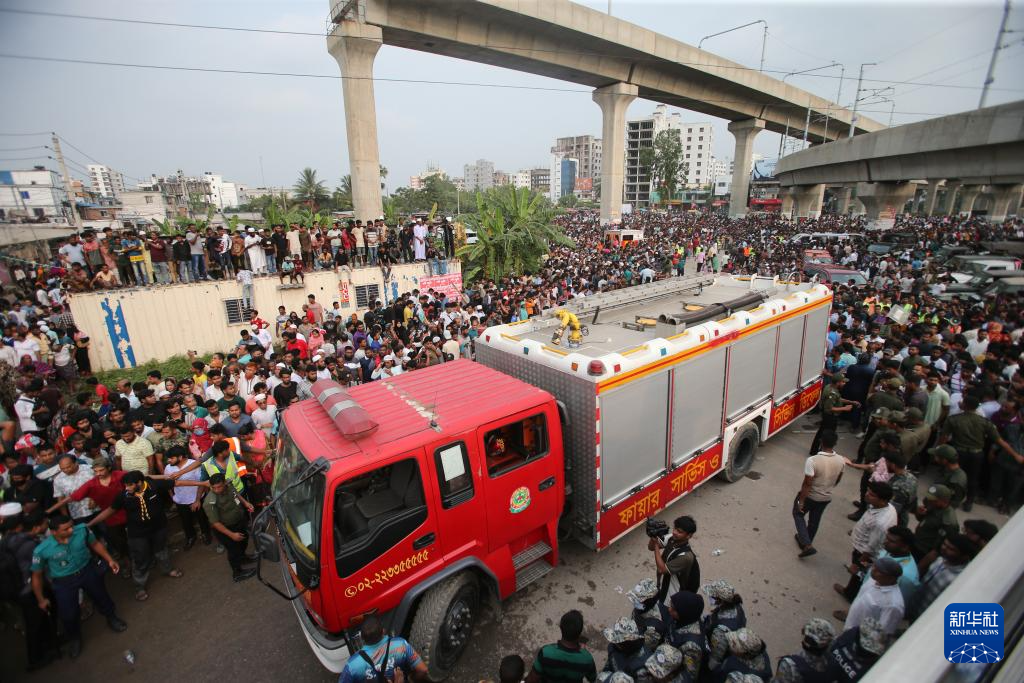 7月21日,在孟加拉国首都达卡,消防人员抵达教练机坠毁现场附近。