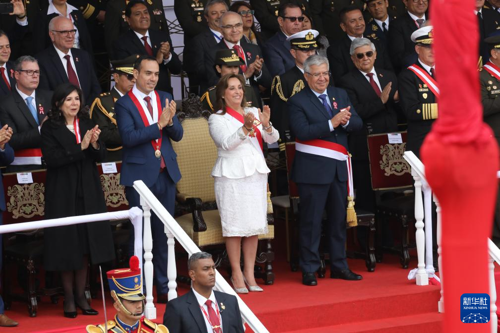 7月29日,秘鲁总统博鲁阿尔特(中)在秘鲁首都利马出席独立日阅兵式。
