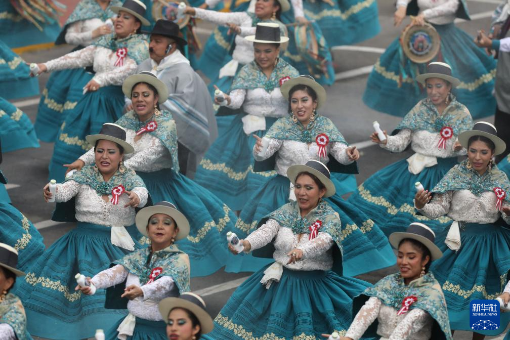 7月29日,在秘鲁首都利马,舞蹈演员在独立日阅兵式上表演民族舞蹈。