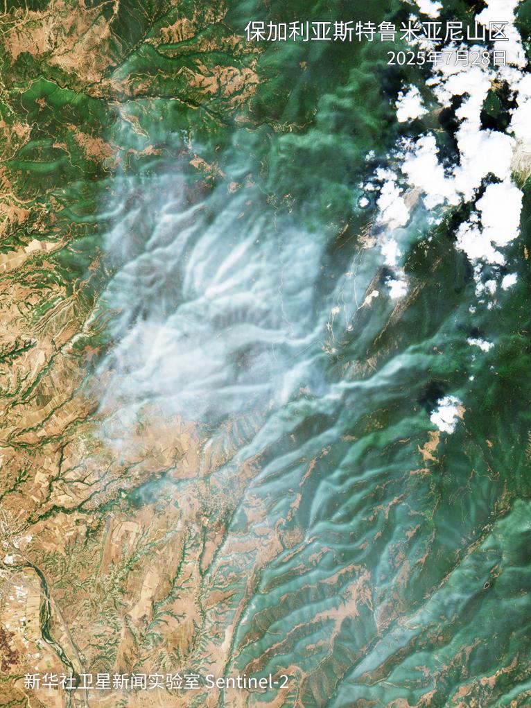 这张拍摄于7月28日的卫星图像显示保加利亚西南部斯特鲁米亚尼山区火势严峻、烟雾持续扩散。(媒体融合生产技术与系统国家重点实验室供图)