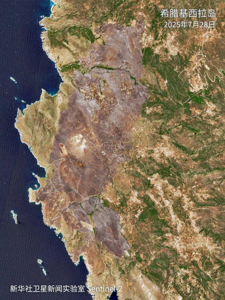这张拍摄于7月28日的卫星图像显示希腊基西拉岛西部一场野火留下的大面积棕黑色过火区域。(媒体融合生产技术与系统国家重点实验室供图)