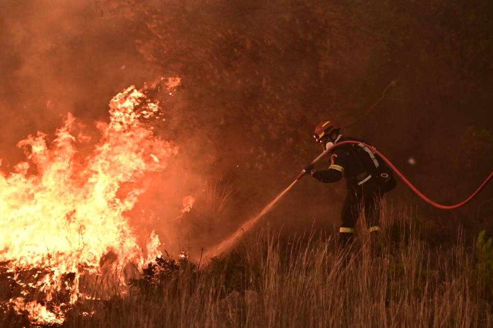 7月26日,一名救援人员在希腊东阿提卡地区德罗索皮吉扑救山火。新华社发(塔蒂亚娜·博拉里摄)