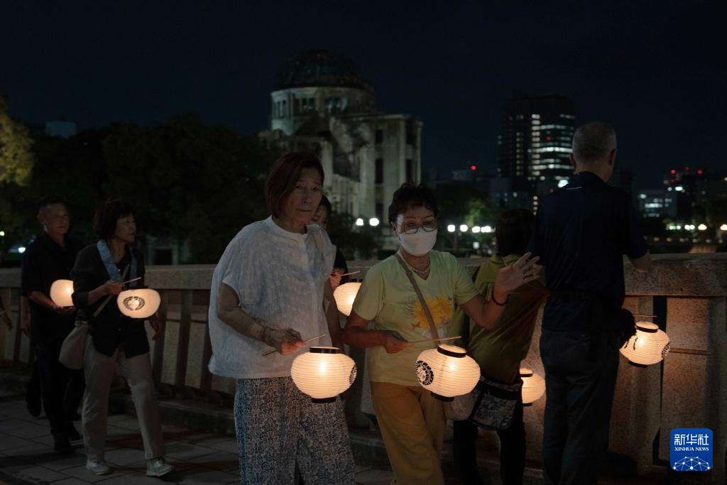 8月5日,为悼念原子弹轰炸遇难者,民众在日本广岛的和平纪念公园附近提灯巡游。新华社记者 贾浩成 摄