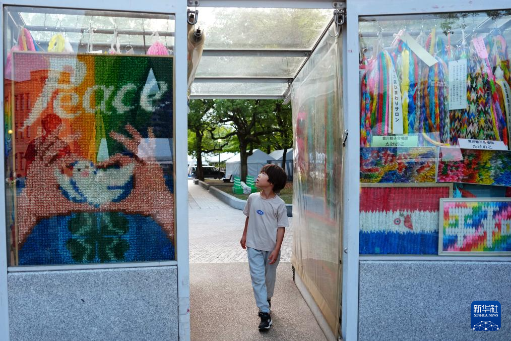 8月5日,在日本广岛和平纪念公园,一名小朋友经过展出的祈愿和平的千纸鹤叠串。新华社记者 贾浩成 摄