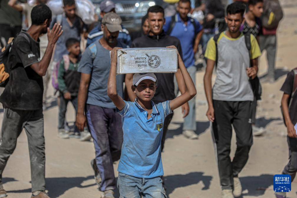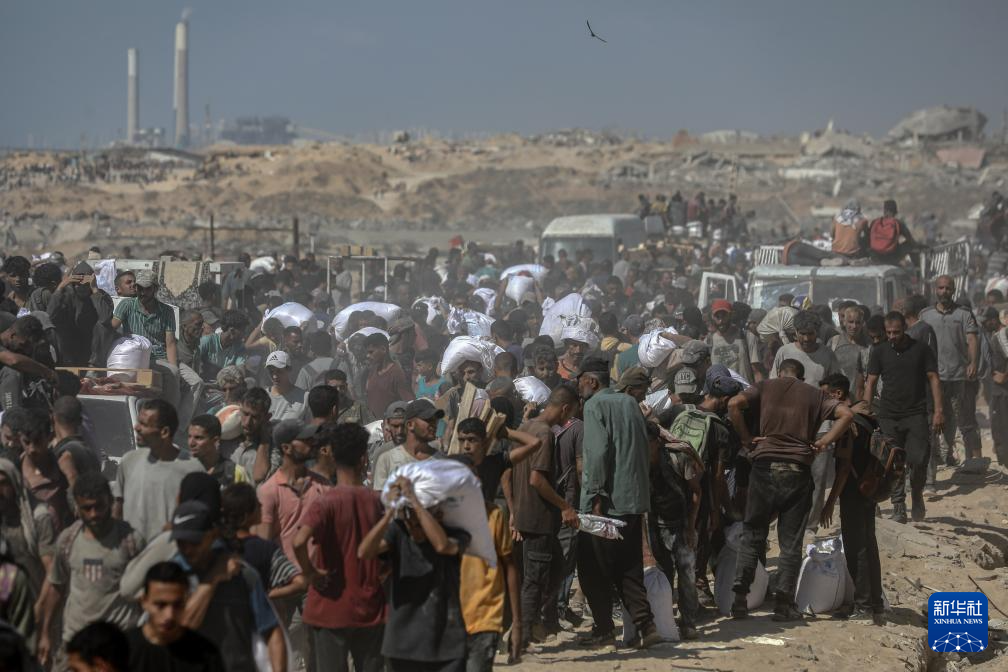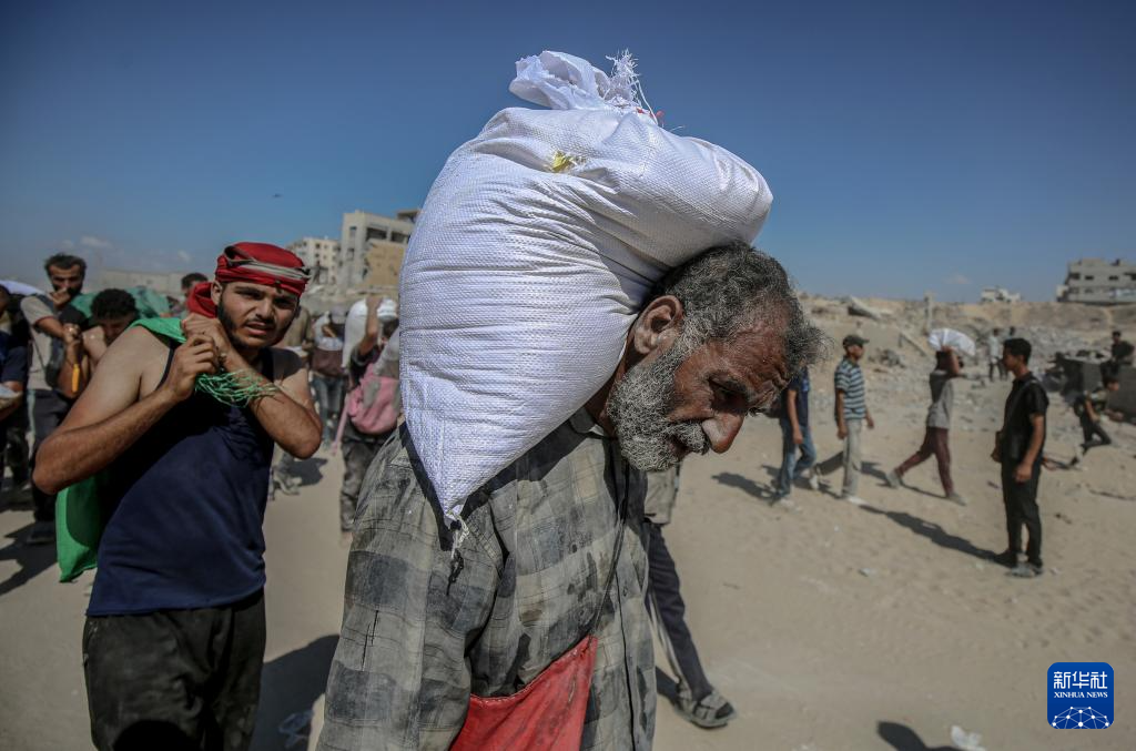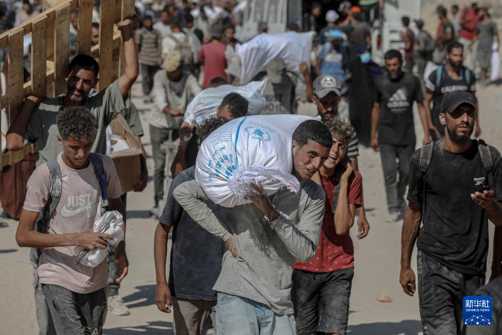 加沙:领取援助物资-8月5日,在加沙地带拜特拉希耶,人们搬运援助物资。'...
