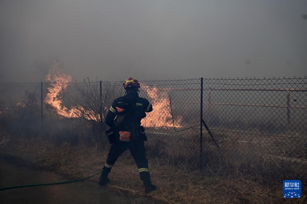 8月8日,希腊首都雅典东南约35公里的凯拉泰阿镇出现严重火情,消防员奋力灭火。