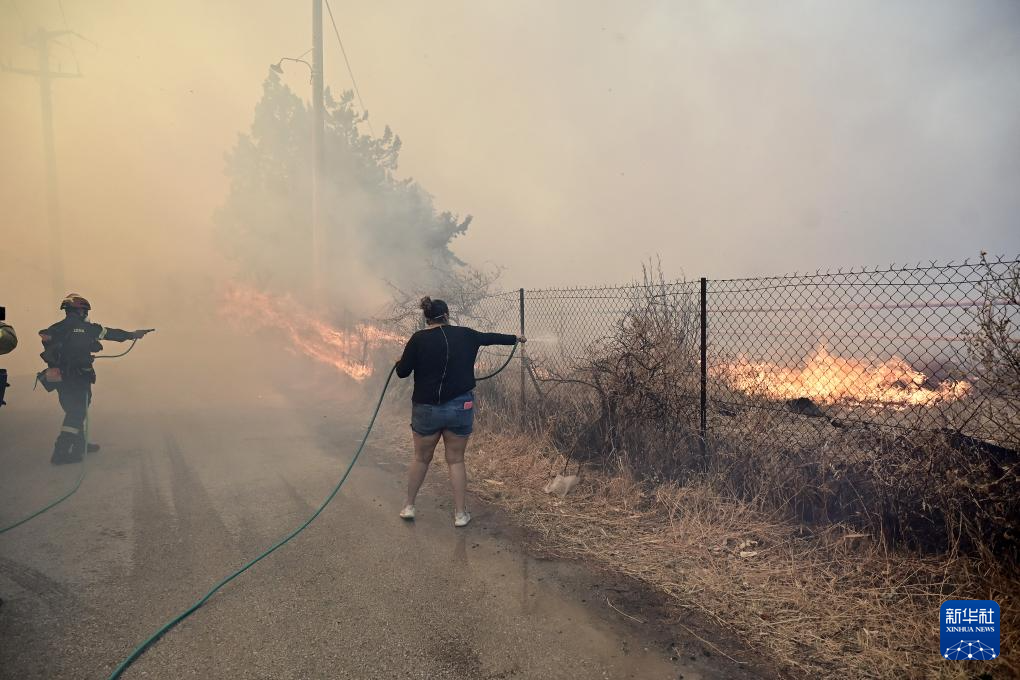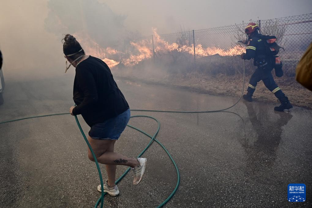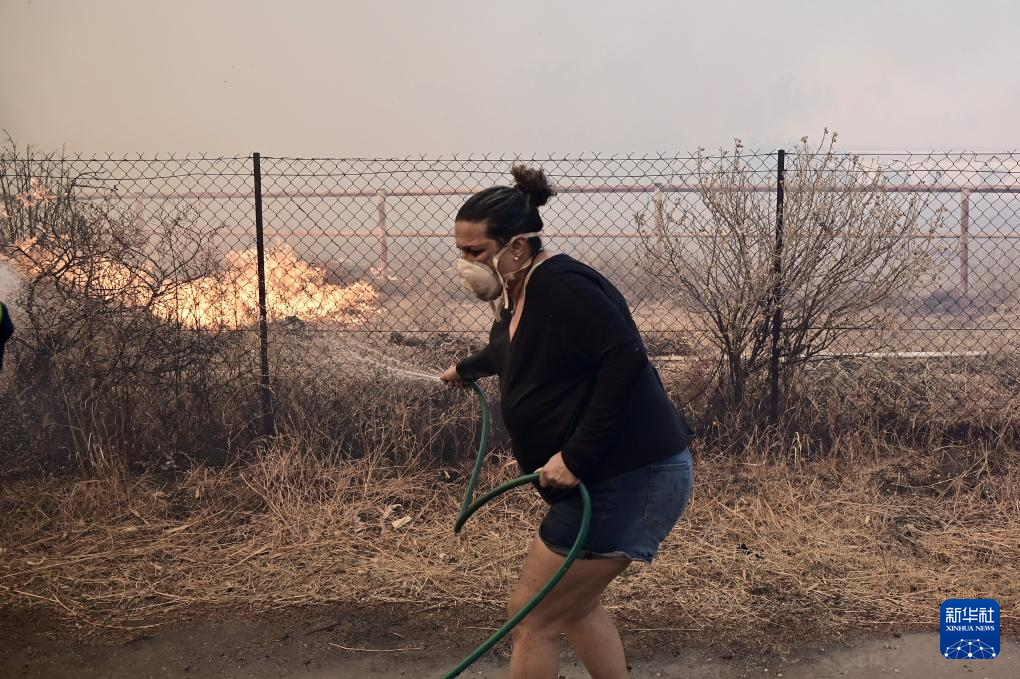 8月8日,希腊首都雅典东南约35公里的凯拉泰阿镇出现严重火情,居民奋力灭火。