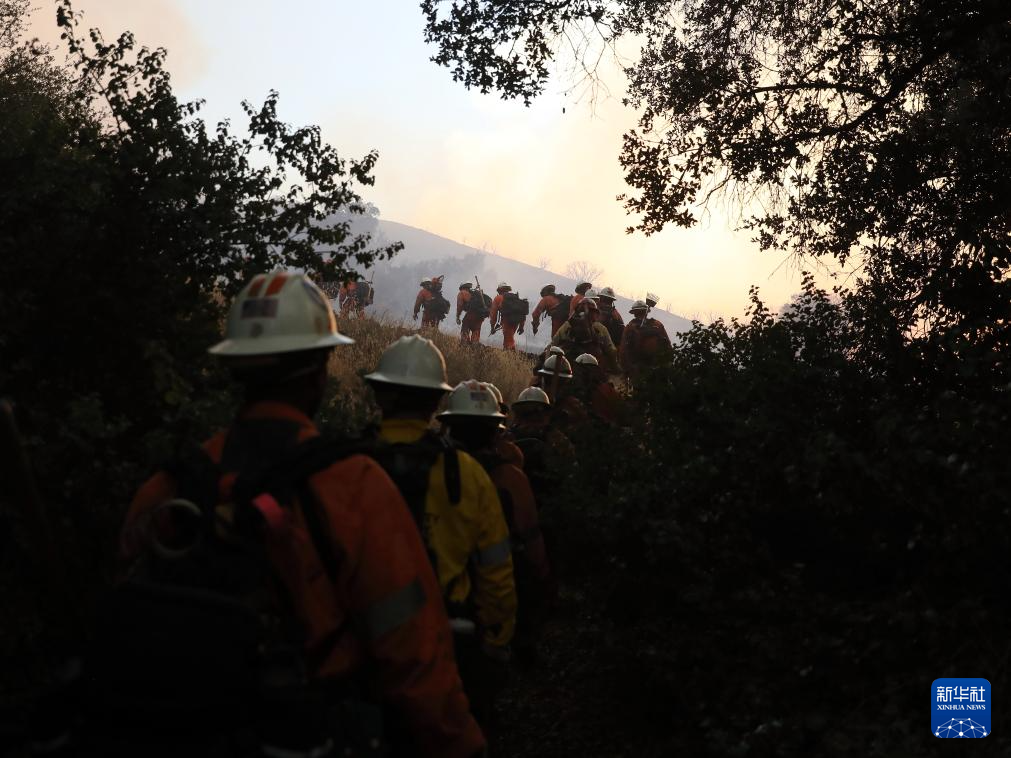8月7日,在美国加利福尼亚州文图拉县,消防员在山火现场转移。