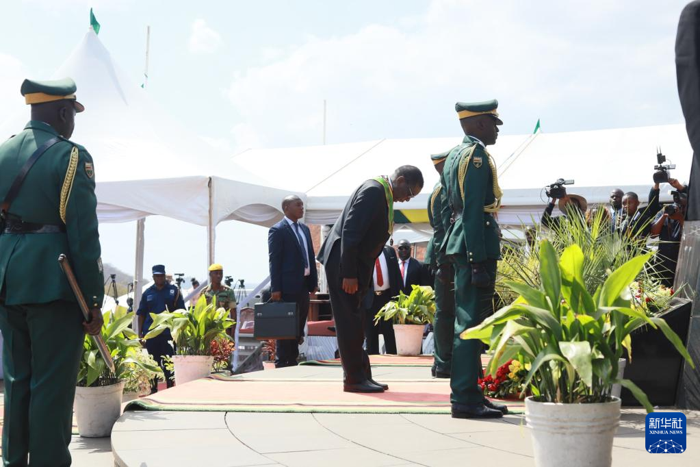 8月11日,在津巴布韦首都哈拉雷举行的第45个英雄日纪念活动上,津巴布韦总统姆南加古瓦(中)向纪念碑鞠躬。