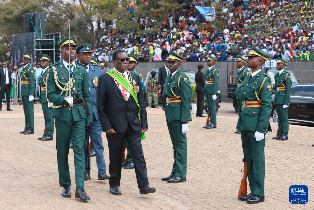 8月11日,津巴布韦总统姆南加古瓦(前左二)在首都哈拉雷出席第45个英雄日纪念活动。