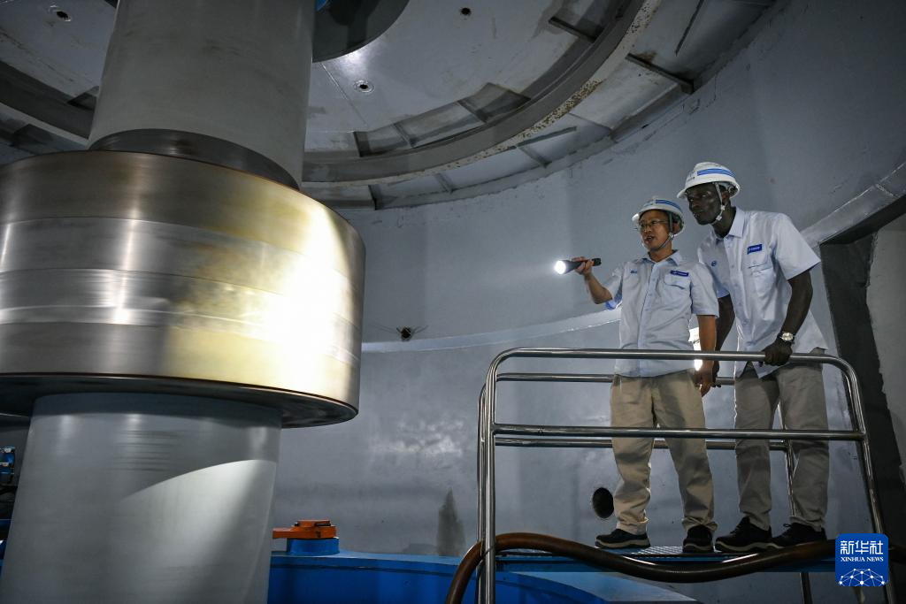 4月24日,在几内亚杜布雷卡省,中几技术人员在凯乐塔水电站的水车室内检查设备运行状况。
