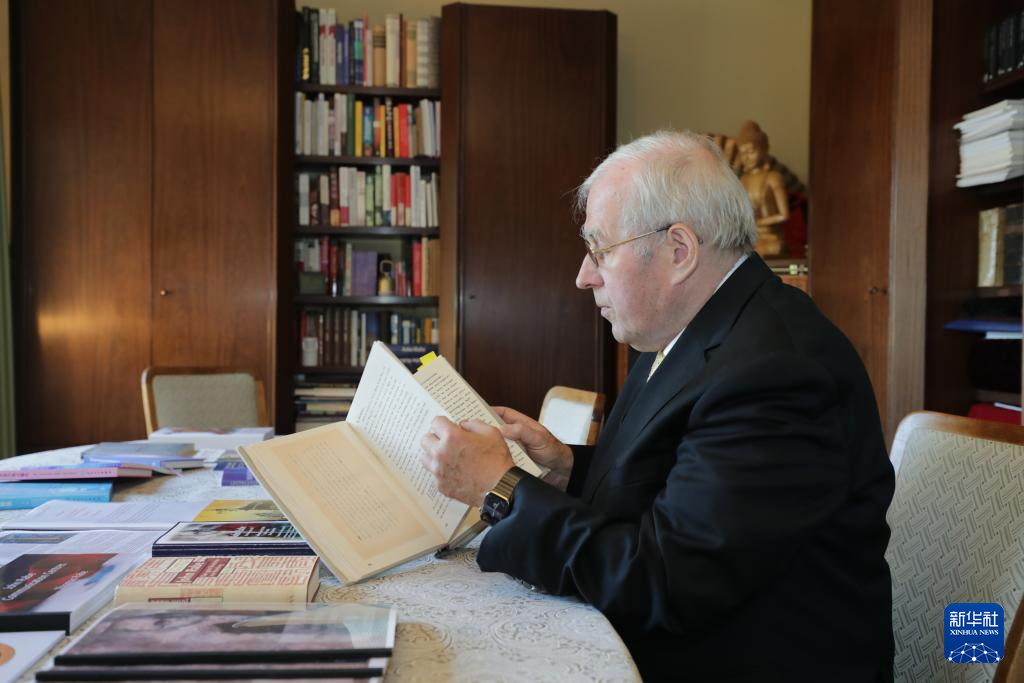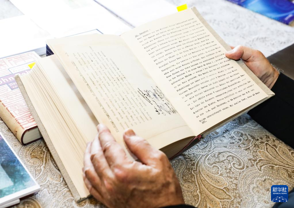 8月7日,托马斯·拉贝在德国海德堡约翰·拉贝交流中心内翻阅《拉贝日记》德文原版图书。